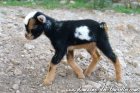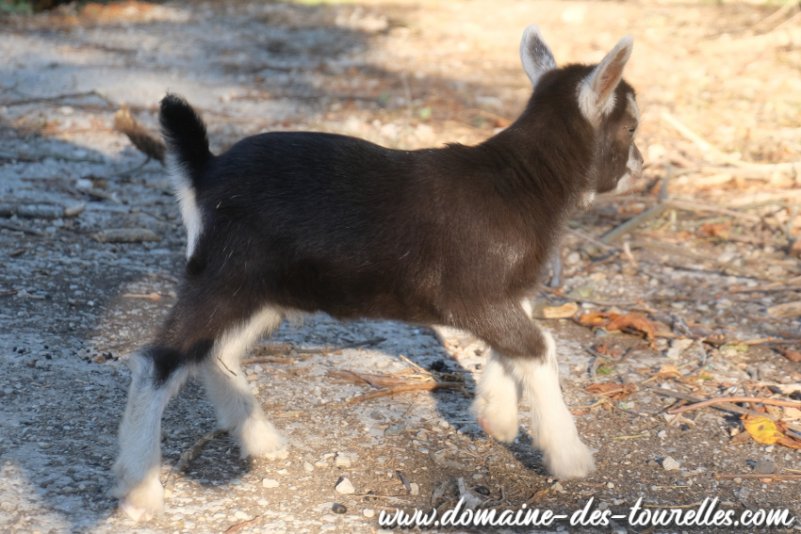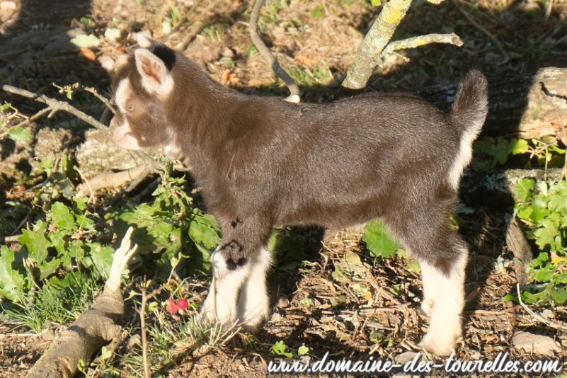 ALIX est un beau chevreau que nous avons découvert au petit matin, couché auprès de sa mère à l'entrée de la chèvrerie. C'est un magnifique chevreau de la peu courante robe chocolat & feu, avec la même caractéristique assez rare qui est le motte* (naturellement sans corne) comme sa maman. C'est un chevreau facile, curieux, très joueur, qui adore sauter de rochers en rochers sur les abords de sa chèvrerie, le plus souvent accompagné par AÏKO ! C'est aussi un chevreau qui a une très belle conformation des plus harmonieuse.