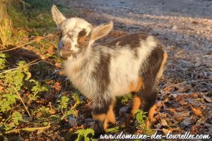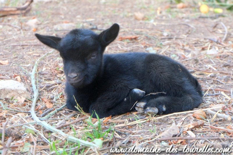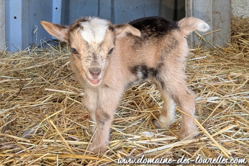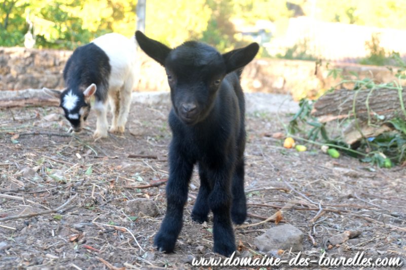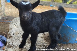 ROMANCE a donné naissance avec quelques difficultés à ACHILLE, il a fallu du temps pour que ROMANCE se dilate suffisamment pour expulser ACHILLE nous faisant craindre une possible césarienne. Heureusement, même si cela a pris un peu de temps, ROMANCE a pu faire naître naturellement son chevreau qui est un joli bout de chou noir avec un coeur blanc sur la tête et une toute petite marbrure chocolat au milieu de son flanc gauche. ACHILLE est un chevreau doux, facile à vivre et c'est un vrai petit gourmand.