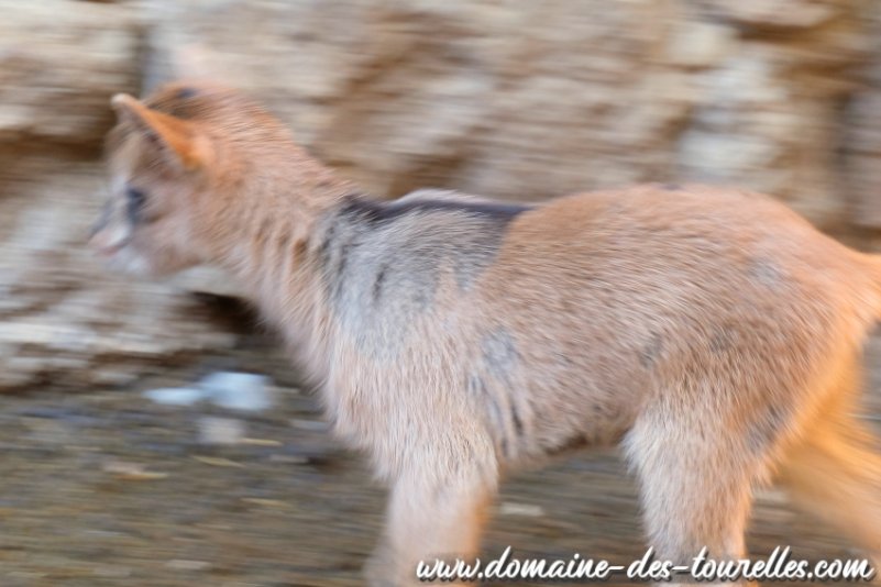 En dernier lieu, les marbrures d'AQUARELLE sont également assez discrètes, pour le moment tout du moins car cela pourra évoluer au fil du temps et même des saisons, puisque ses marbrures sont composées de poils avec une base de couleur différente de la pointe. Ainsi, près de la peau, la base du poil est noire, sur la pointe la couleur est grisée assez clair, sauf sur l'échine ou réapparaissent sans atténuation les marques noires du sauvage.