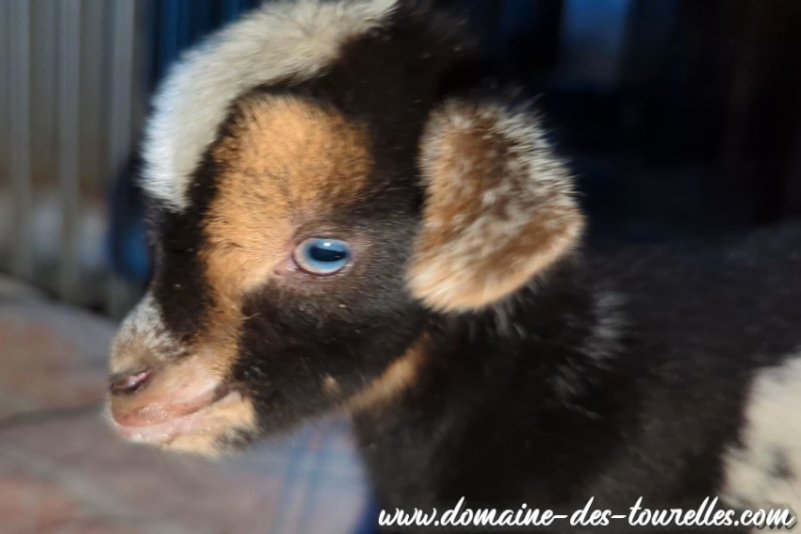 * Yeux bleus : yeux toujours bicolores chez les caprins (bleu en pourtour de la pupille et marron en pourtour de l'iris, à des proportions différentes selon les individus)