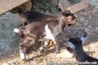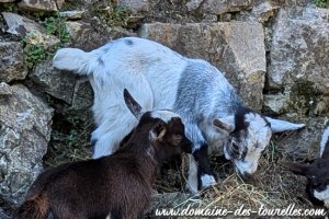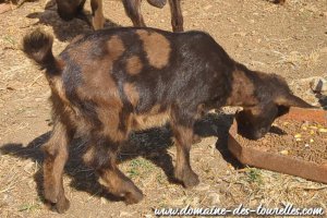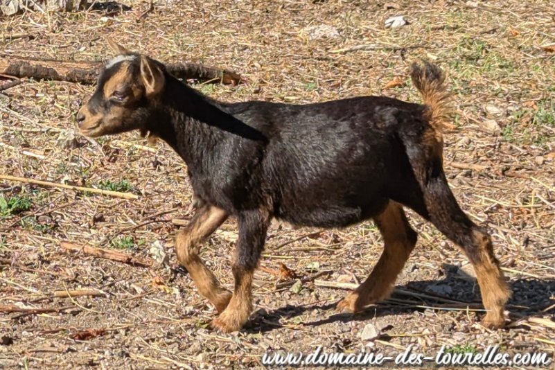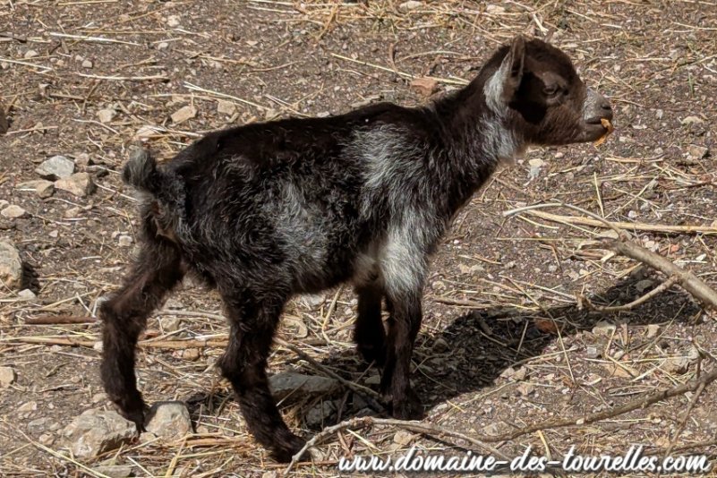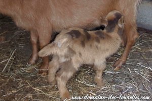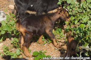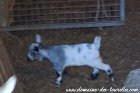 LOLIPOP a donné naissance, une fois n'est pas coutume, à des jumeaux quasi identiques et de couleur très classique qui est le noir. ALIBERT présente des oreilles et bout du nez quasiment entièrement blancs tant le gêne frosting* est fort. Il porte également la même caractéristique que celle de sa maman qui est le gêne motte*. ALIBERT est le plus vif et dégourdi des jumeaux. Quant à ALAMBIX, c'est un chevreau de tout petit gabarit, un toy ou extra-toy de naissance, mais c'est aussi un chevreau bien moins vif et facile que son frère. Frileux la nuit malgré les températures estivales, il n'arrive pas à retrouver sa mère dans la chèvrerie et son frère tête tout avant qu'il n'arrive. De ce fait, nous l'avons retiré de sa maman pour lui faire accepter le biberon, ce qui n'a pas été facile... l'artificialité de la tétine et du lait, rend régulièrement l'acceptation difficile et dans de plus rares cas impossible. Mais l'isolement au sein d'un mini groupe de jeunes chevreaux et le lait à volonté ont néanmoins bien aidé et ont vite été apprécié par ALAMBIX, une fois le déclic psychologique affectué.