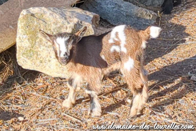 ALIZARINE est une jolie petite chevrette, assez fine d'aspect, de la peu courante couleur pie chocolat rouan. ALIZARINE a malheureusement été rejetée par sa maman, nous l'avons de ce fait prise avec nous au biberon. Mais c'est une chevrette un peu fragile... j'ai un doute sur la qualité du colostrum de sa maman que nous lui avons fait téter avant de la prendre avec nous. Mais c'est aussi une chevrette très câline et très proche de nous, avide d'attention et très gourmande... ainsi qu'obsédée par nos lacets ! Elle est tout le temps en train de venir mâchouiller et tirer sur les lacets.