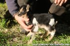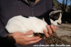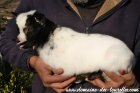 BROWNIE est un joli petit mâle pie noir à dominance blanche, avec des marques feu sundgau* qui amènent une touche chaude à la robe. L'on dirait que BROWNIE est maquillé avec le pourtour des yeux noirs et surtout les lèvres qui sont entourées de noir. Il porte également une originalité sur son oreille droite qui est bicolore, avec la partie avant blanche et la partie arrière noire ! C'est un chevreau de gabarit limité, possiblement à la limite entre l'extra-nain et le nain. De jolie conformation avec une petite bouille mutine ainsi qu'une robe contrastée, c'est un loulou qui sait attirer l'oeil.