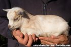 En ce qui concerne BALTHAZAR, il a hérité de la robe de sa maman qui est peu courante, il s'agit du sauvage charbonné (le gêne charbonné fonce la robe qui serait de base marron, mais il la fait apparaître noire). BALTHAZAR porte de jolies barrettes sur le visage et c'est lui aussi un chevreau de gabarit limité, à priori extra-nain pour le moment.