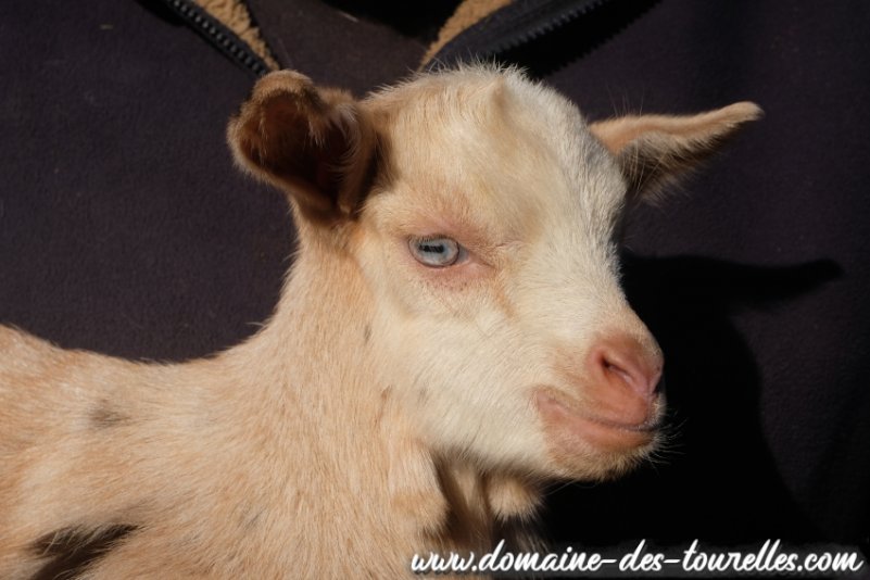 * Yeux bleus : yeux toujours bicolores chez les caprins (bleu en pourtour de la pupille et marron en pourtour de l'iris, à des proportions différentes selon les individus)