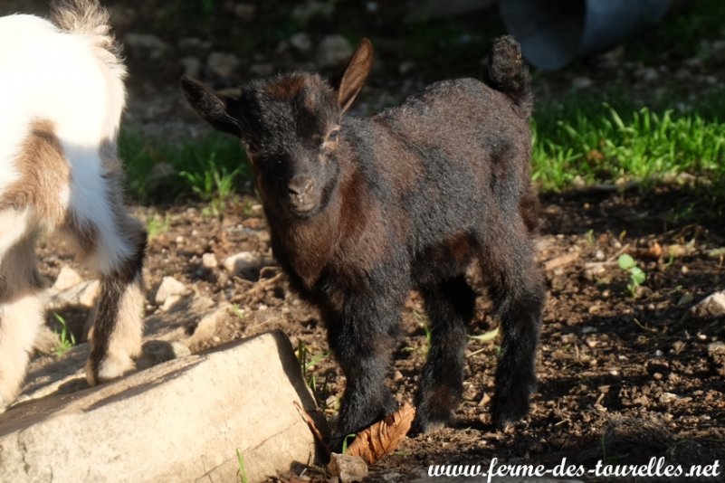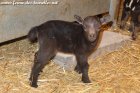 PANDALA est un chevreau à la robe noire & feu peu courante voire même rare. C'est une couleur qui a été un porte-poisse à mes débuts car j'ai perdu les chèvres que j'avais pu sélectionner dans cette couleur par arrêt de rumination, la plupart après avoir ingéré des corps étranger sur les routes pour aller en pâture (type plastique jetés en bord de route, etc.). J'ai donc mit du temps pour pouvoir commencer à réellement faire naître ce type de couleur. Je suis heureuse que PANDALA ait pu donc être un joli bout de chou de cette robe, avec le bas des pattes entièrement feu comme sa maman. C'est un chevreau plutôt calme et sage... mais une vraie pipelette dès qu'il est dehors avec le troupeau ! Il ne s'arrête pas ! C'est sa façon d'être sûr de ne pas être abandonné par le troupeau et qu'on ne l'oublie pas. Le pastoralisme pour se rendre à des kilomètres de la ferme dans des terrains régulièrement différents ne rassurent pas toujours les bouts de chou qui, pour certains, ont peur de se perdre.PANDALA est parti chez Claire (Luxembourg)