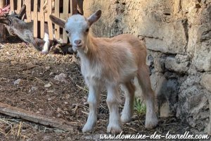 TIKIA a donné naissance au retour du pastoralisme d'un très joli chevreau à la génétique peu courante et identique à celle de sa maman. D'une belle teinte orangée très chaleureuse, ANTOINE attire l'oeil. Ses marbrures plus nombreuses et essentiellement regroupées sur la droite de son corps sont de teintes très douces et vont peu à peu s'éclaircir pour devenir d'un ton beige clair, ce qui va le faire apparaître très discrètement. ANTOINE a également hérité le gêne motte* de sa maman. C'est un chevreau très doux et gentil, calme et de caractère posé. Eric l'a complété au biberon car sa maman était limitée dans sa production de lait en cette saison estivale pas facile.