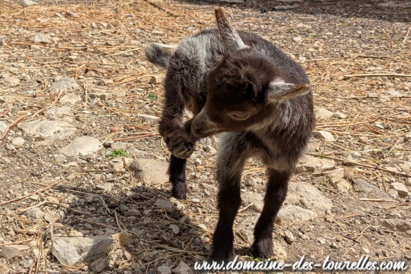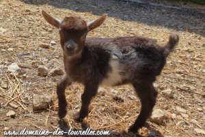 LOLIPOP a donné naissance, une fois n'est pas coutume, à des jumeaux quasi identiques et de couleur très classique qui est le noir. ALIBERT présente des oreilles et bout du nez quasiment entièrement blancs tant le gêne frosting* est fort. Il porte également la même caractéristique que celle de sa maman qui est le gêne motte*. ALIBERT est le plus vif et dégourdi des jumeaux. Quant à ALAMBIX, c'est un chevreau de tout petit gabarit, un toy ou extra-toy de naissance, mais c'est aussi un chevreau bien moins vif et facile que son frère. Frileux la nuit malgré les températures estivales, il n'arrive pas à retrouver sa mère dans la chèvrerie et son frère tête tout avant qu'il n'arrive. De ce fait, nous l'avons retiré de sa maman pour lui faire accepter le biberon, ce qui n'a pas été facile... l'artificialité de la tétine et du lait, rend régulièrement l'acceptation difficile et dans de plus rares cas impossible. Mais l'isolement au sein d'un mini groupe de jeunes chevreaux et le lait à volonté ont néanmoins bien aidé et ont vite été apprécié par ALAMBIX, une fois le déclic psychologique affectué.