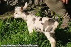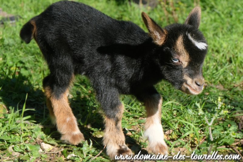 * Yeux bleus : yeux toujours bicolores chez les caprins (bleu en pourtour de la pupille et marron en pourtour de l'iris, à des proportions différentes selon les individus)