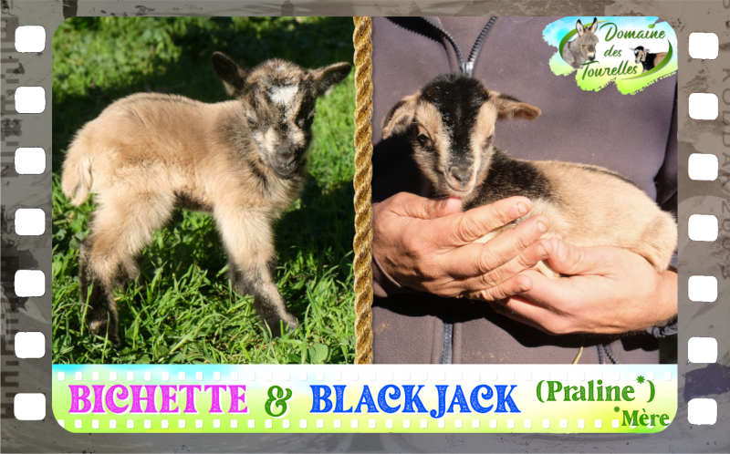Quant à BLACKJACK, c'est un chevreau proche de sa maman, joueur mais plutôt calme. Il porte la robe de sa maman avec une cape noire bien visible sur l'avant-main, ainsi que les marques feu de son papa qui s'expriment notamment avec des chaussettes jaunes clairs, de la même teinte que sa robe ainsi que des barrettes sur le visage (traits clairs depuis le dessus des yeux jusqu'au menton).