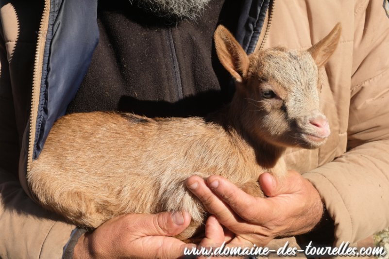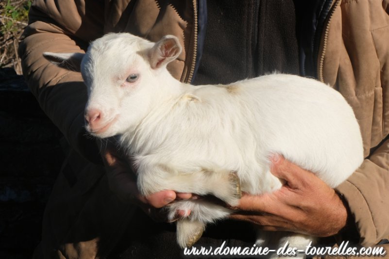 NEVA a mis bas en pastoralisme à plusieurs kilomètres de la ferme et malheureusement le long retour d'ASCOT dans les bras d'Eric lui ont fait perdre l'odeur de son fils et NEVA n'a plus voulu de lui à son arrivée à la ferme. Elle le recherchait, l'appelait mais repoussait ASCOT qu'elle n'a plus réadopté. Nous avons donc dû le prendre au biberon et l'avons pris avec nous près du chauffage pendant quelques jours car c'est un petit chevreau qui a été un peu frileux. C'est aussi un gros bébé qui ne sait pas trop se défendre face aux autres chevreaux ou chèvres... et dans un troupeau, ce genre de chevreau court donc plus de risques car les chèvres ne se font pas de cadeaux entre elles. C'est pourquoi, nous le maintenons un peu à part avec quelques autres bouts de chou élevés comme lui au biberon même s'il a accès aux chèvres s'il en a envie. C'est le meilleur ami de ARTISTIC qui lui aussi est de petite taille et de caractère doux et sans agressivité. ASCOT a hérité de sa maman son raffinement et il a hérité de son papa quelques petites tâches blanches, possiblement sa génétique d'herminé... j'avoue que j'ai été un peu déçu qu'ASCOT n'ait pas hérité des magnifiques yeux bleus de sa maman. Mais la petite taille ainsi que la bouille à croquer de ASCOT, sa familiarité et sa gentillesse ne peuvent que nous faire craquer !