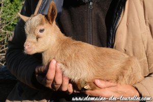 TEMPO fut une naissance surprise que sa maman primipare n'a absolument pas voulu. Nous l'avons donc élevé au biberon à la maison avec nous. Ce fut longtemps un chevreau / jeune bouc très attaché à moi, ne s'intéressant pas aux autres chèvres. Il se comportait comme s'il était mon bébé. Chevreau de gabarit toy, c'est devenu un magnifique petit bouc raffiné, très gentil, doux et calme de caractère. Il est de lignée différente de nos autres chèvres et boucs (hormis sa mère), mais nous avons trop de boucs et devons faire des choix parfois difficiles...