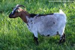 OSKY est un rare bouc à la robe pie chocolat dilué ! La teinte de couleur est identique à celle de sa mère que j'apprécie tout particulièrement, il a hérité d'elle le gêne peu courant motte*. Il a une panachure très intéressante car d'une part non dominante, laissant ainsi sa couleur bien visible, et d'autre part sa panachure est joliment répartie par des tâches moyennes, essentiellement présentes sur la partie arrière de son corps. OSKY a un comportement plutôt calme et tranquille. J'espère qu'il pourra transmettre sa robe à ses futurs descendants. OSKY est parti chez Jérôme (Manche - 50)