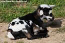 PAKO est un adorable chevreau de gabarit toy de naissance, de la rare couleur pie noir & feu ! En effet, cette couleur en toy est vraiment pas courante, c'est le moins que l'on puisse dire car déjà toute taille confondu, il n'est pas facile d'en trouver ! Sa robe est quasiment unie, seule une petite tâche blanche sur le bas de son flanc droit le rend pie. PAKO est tout mignon, avec une craquante petite tête. Il a hérité de la génétique mais non diluée de sa maman. J'attends de voir son évolution notamment au niveau de sa taille pour confirmer son gabarit toy ou extra-nain. PAKO est parti chez Vicky (Pas-De-Calais - 62)