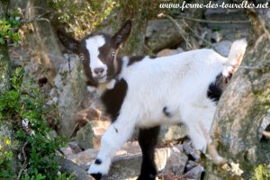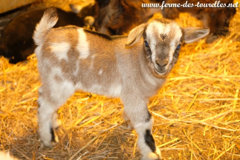 SALLEY est un beau chevreau de petit gabarit (toy de naissance) tout en raffinement et rondeurs, et une splendide couleur peu courante arborant des contrastes chatoyants que ces photos prises par temps sombre ne montrent pas ! Nous avons dû prendre SALLEY au biberon car personne n'a voulu de lui. Quant à SAKIA (pas de photos disponibles) est une toute toute petite chevrette, particulièrement menue, très étroite, et avec une très jolie robe pie chocolat aux tâches circulaires toutes en dégradé depuis l'avant-main jusque à l'arrière-main. SAKIA a été adoptée par REINE, mais je ne sais pas s'il s'agit bien de sa maman biologique, en tout cas, elle en prend bien soin. Cependant, du fait du très petit gabarit de SAKIA, cela fait 3 semaines que je laisse le duo en case de mise bas, mais REINE (qui sort tous les après-midi en pastoralisme néanmoins) en a marre, je vais donc bientôt lâcher SAKIA, en espérant qu'elle soit assez forte face aux autres chevreaux de plus grands gabarits notamment. Dans tous les cas, il est important qu'elle se socialise avec d'autres animaux que sa seule maman.