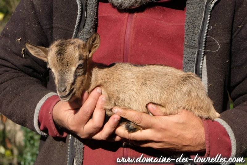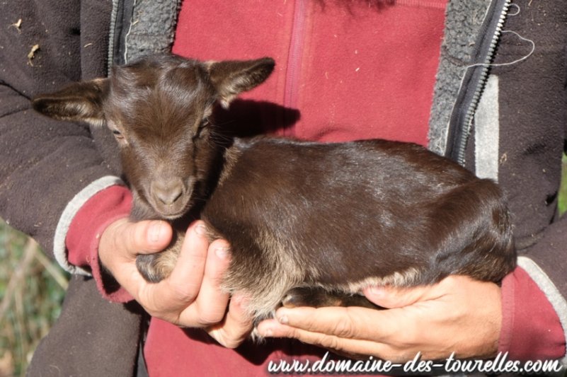 USTY est un très joli et petit chevreau de robe de base noire comme sa maman, et qui a hérité des rares et jolies marbrures de son papa. Les marbrures devraient être plus visibles et contrastées au fur et à mesure du temps car le chocolat (qui forme les marbrures, cela fonctionne de la même manière pour les robes chocolats qui sont plus foncées à la naissance) est naturellement plus foncé à la naissance. C'est une couleur qui s'éclaircit plus ou moins les mois suivant la naissance et qui peut varier de teinte selon les saisons. Les marbrures de USTY sont de teinte toutes différentes les unes des autres. Certaines sont tellement claires qu'elles sont proches du blanc, alors que d'autres sont chocolat très foncé... il y a de toutes teintes, pour tous les goûts ! USTY est de petit gabarit, et c'est un chevreau adorable, plutôt calme et zen de caractère, gentil et facile à vivre. C'est un loulou qui aime grimper sur mes genoux lorsque je suis assise, et encore mieux, grimper sur mon dos si cela lui est possible, et depuis mes épaules, il est content et observe tout sous un autre angle, il s'amuse à sautiller ou demande des câlins. Ainsi, je l'élève au biberon à la maison, dans la pièce chauffée que nous avons aménagée. En effet, son début de vie n'a pas été facile. Lors de sa naissance, il arrivait mal positionné et du fait du petit gabarit de sa maman, nous ne sommes pas arrivés à intervenir manuellement pour repositionner le chevreau. Une césarienne a été nécessaire... avec la peur au ventre pour nous car l'année dernière, nous avons perdu une majorité de chèvres en césarienne qui, sans en comprendre la cause, n'arrivaient pas à se réveiller... alors que tout s'est parfaitement passé sans le moindre souci depuis près de 15 ans en amont ! Mais heureusement, pour RAYANA, tout s'est très bien passé. Mais elle a rejeté son fils qu'elle ne voulait pas faire téter, et USTY était un peu brusque pour demander à téter à sa maman, il lui donnait de gros coup de nez dans la mamelle afin de stimuler la descente du lait... mamelle très proche de la cicatrice de la césarienne sur le bas du ventre. Ainsi, nous avons préféré pour le bien des deux loulous, prendre USTY avec nous et laisser RAYANA tranquille, se remettre à son aise de sa césarienne. Au bout de quelques jours, elle a adopté un autre chevreau qui aura l'avantage d'avoir 2 mamans pour lui tout seul ! N.B. : il a fallu ruser le lendemain de son opération pour coincer RAYANA afin de la faire rester dans la chèvrerie afin qu'elle ne fasse pas les kilomètres de marche en terrain varié pour partir en pastoralisme... mais elle aura déjoué notre vigilance le surlendemain et n'a montré alors aucune faiblesse ou gêne en suivant parfaitement les autres chèvres ! Quelle résistance ! USTY est parti chez Julie