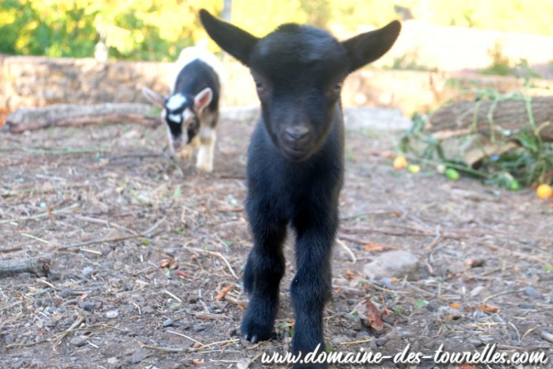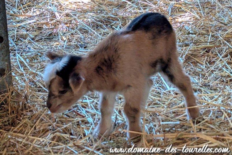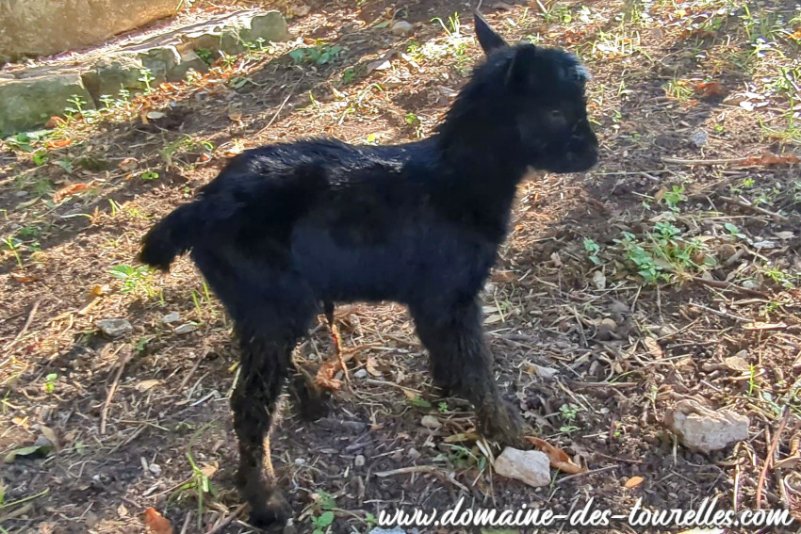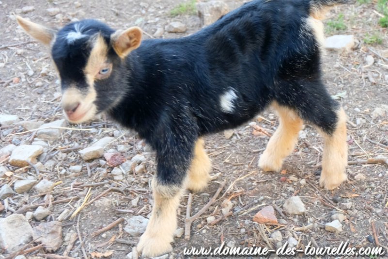 ROMANCE a donné naissance avec quelques difficultés à ACHILLE, il a fallu du temps pour que ROMANCE se dilate suffisamment pour expulser ACHILLE nous faisant craindre une possible césarienne. Heureusement, même si cela a pris un peu de temps, ROMANCE a pu faire naître naturellement son chevreau qui est un joli bout de chou noir avec un coeur blanc sur la tête et une toute petite marbrure chocolat au milieu de son flanc gauche. ACHILLE est un chevreau doux, facile à vivre et c'est un vrai petit gourmand.