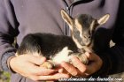 En ce qui concerne BALTHAZAR, il a hérité de la robe de sa maman qui est peu courante, il s'agit du sauvage charbonné (le gêne charbonné fonce la robe qui serait de base marron, mais il la fait apparaître noire). BALTHAZAR porte de jolies barrettes sur le visage et c'est lui aussi un chevreau de gabarit limité, à priori extra-nain pour le moment.