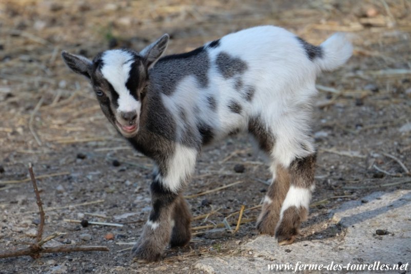MAGELLAN est un très beau chevreau avec une robe rare. En effet, il porte 3 couleurs : le blanc, le noir et le bleu (noir dilué) sur les épaules notamment. C'est la première fois que je vois ce type de robe mélangeant le bleu et le noir telle 2 couleurs différentes. De plus sa robe dissymétrique et sa jolie bouille finissent de rendre ce petit bout de chou exceptionnel à bien des égards. MAGELLAN est parti aux côtés de sa maman dans la famille d'Eric (Moselle - 57)