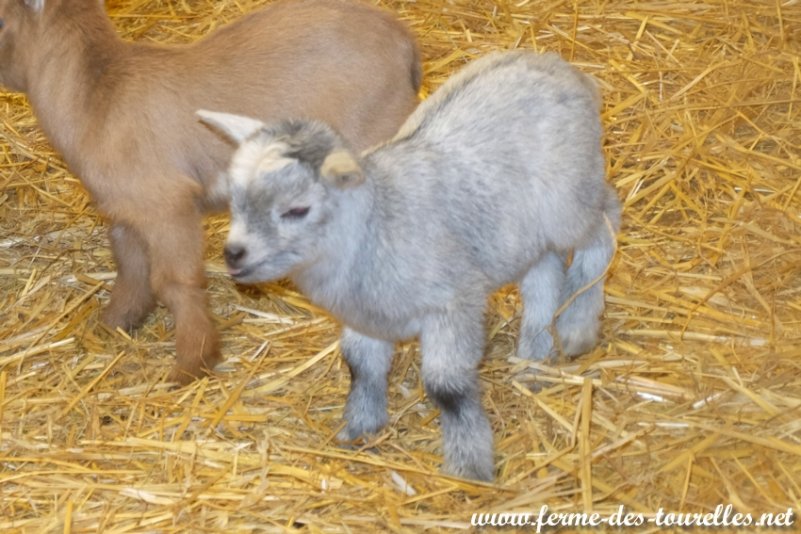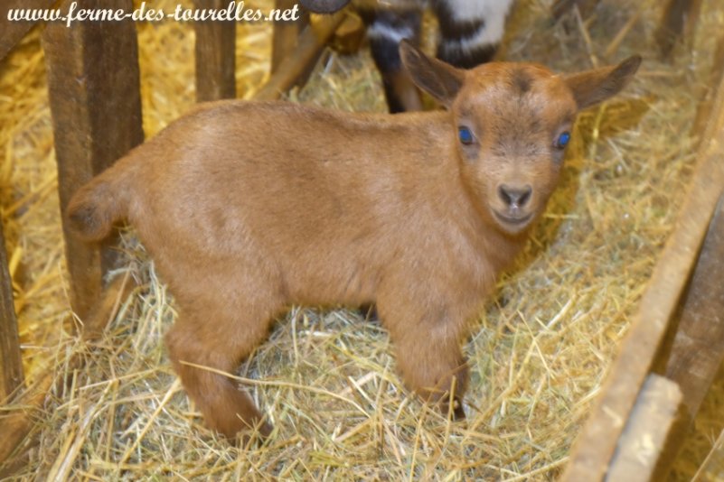 Notre exceptionnelle petite HAPPYNETTE qui est une reproductrice d'exception en ayant toujours donné naissance à des chevreaux de très petite taille (toy et extra-toy), souvent mottes... elle a une nouvelle fois mis au monde de jolis jumeaux d'exception. Ils devraient eux aussi être de petit gabarit, toy voire peut-être extra-nain. Tout deux sont aux yeux bleus* et possiblement mottes* (OLYMPY en a toutes les caractéristiques à priori, mais j'ai des doutes encore concernant ONDINE). Leurs robes sont également exceptionnelles puisque très rare : chocolat & feu pour ONDINE, et à priori pie chocolat & feu pour OLYMPY avec une jolie panachure mais sa teinte de robe est tellement foncée qu'elle paraît noire pour le moment sauf sur le visage chocolat, c'est pourquoi, je pense que sa robe est bien de base chocolat. L'avenir nous le confirmera puisque le chocolat s'éclaircit toujours un peu les semaines passant... C'est ainsi que tant leur petit gabarit, leurs yeux bleus*, leur caractéristique motte*, leur robe et leur jolie conformation les rendent extraordinaires et exceptionnels ! De vrais petits bijoux ! ONDINE est réservée à l'élevage en tant que future reproductrice / OLYMPY n'est pas disponible.