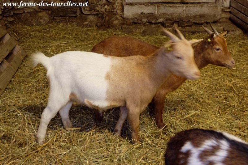 MANDARINE est une des petites merveilles (uniquement des femelles) auxquelles a donné naissance notre gentille JILIADE ! MANDARINE est née presque blanche tant ses tâche beiges étaient claires. Je n'ai réellement découvert sa robe qu'au fil des mois passant, lorsque le beige s'est intensifié (vous pouvez voir l'évolution de MANDARINE sur le diaporama ci-après). MANDARINE est une gentille chèvre, douce et posée... et très "famille" comme l'est sa lignée maternelle ! Elle a une belle robe tâchetée dont la teinte varie au fil des saison depuis une teinte de beige très clair jusqu'à plus intense comme sur les photos ci-dessus. > Voir diaporama de MANDARINE (et sa jumelle Miline) bébé |
